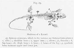 In presenting these specimens Buckley often inserted two illustrations, as can be seen in figures 3 and 4: the first depicted the animal as normally seen; and the second presented the same animal in the same posture but with the soft tissue removed to reveal the skeleton beneath. In addition, each of the skeleton illustrations featured a common pattern of labelling (compare figs 4 and 5) – a scheme which allowed Buckley to draw the reader’s attention to the unexpected similarity of anatomical construction in these apparently very different sorts of animals. The educated gaze, she thus suggested, is able to see beyond the apparently radical differences between these classes of animals and to discern elements of structural convergence. This underlying similarity can act as the basis of an implied narrative of common descent. In the text, Buckley worked up this sense of connection by the extensive use of two related metaphors, the first centred on the notion of the family and family relations, and the other on the notion of the competitive race. These are already visible in Buckley’s titles, Life and her Children, and Winners in Life’s Race. Briefly, the first metaphor works to join different animal-types together under the auspices of a shared genealogy as the ‘children' of a loving mother (Nature); while the second serves to introduce the notion of dynamic hierarchy or progress, with some ‘children' becoming progressively more advanced, physically or morally, than others [5].