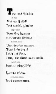 Séduit lui aussi par le monde de l’image, Jean-François Bory cherche également à rendre à l’alphabet latin sa dimension iconique et à le faire glisser vers l’idéogramme. C’est ainsi qu’il voue une admiration sans bornes au célèbre poème « A leaf falls » (1958) de Cummings, auquel il prête justement la qualité d’un idéogramme : ce poème de l’écrivain américain lui apparaît comme la matérialisation graphique d’une idée, celle la solitude, dont la chute d’une feuille d’arbre serait une métaphore. Dans un ouvrage intitulé Le cagibi de MM. Fust et Gutenberg (2003), il se penche à son tour sur l’aspect graphique des lettres, dont il fait varier le style, le corps, la police, la graisse au sein d’un même mot afin d’en enrichir le sens. Les lettres se décalent, font zigzaguer, onduler les lignes. Le choix de Gutenberg, inventeur de l’imprimerie, et de Fust, son complice et financier, n’est pas anodin : il rappelle le rôle fondamental des caractères mobiles dans la lecture d’un poème, car « autant l’invention des caractères mobiles dans les civilisations de l’idéogramme a été perçue par elles comme une source d’embarras plus que de progrès, autant elle a apporté à l’Occident un bouleversement fondamental dans sa façon de penser la lettre, et de l’interroger » [14]. Le regard est sans cesse attiré par ces variations. Sur une page, le mot « tout » varie typographiquement du début à la fin tout en rythmant le poème par un effet d’anaphore (fig. 11). Les connecteurs logiques sont écrits dans un format réduit, comme pour manifester leur moindre importance et introduire une hiérarchie entre les mots : « et déjà », « et pourtant », « bientôt, alors », « et, très vite ». Le contenu des vers exprime à l’évidence la perplexité du lecteur, désarçonné par l’aspect peu conventionnel du texte. Perturbé dans ses habitudes de lecture, celui-ci oscille entre des impressions contradictoires, égrainant en pensée des séries d’antonymes : illisible-lisible ; bizarre-habituel ; différent-monotone ; tremble-fixe ; dans ses gonds-dégondé ; adieux-commence : cette poésie d’un genre nouveau incarne-t-elle à la fois des « adieux » à une perception « monotone » en vue d’un nouveau « commencement » ?