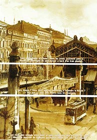 Technique également très cinématographique, passée dans le langage du documentaire ou reportage télévisuel, adaptée au langage de la BD de reportage, le split audio consiste à décaler le son par rapport à l’image : le lecteur ne découvre que dans un second temps les protagonistes du dialogue inscrit en sous-titres lumineux sur l’écran. Vandermeulen utilise le procédé à l’amorce de chaque nouvelle séquence (en tête ou au milieu d’un chapitre) comme moyen efficace de relance du récit. Le décor sur lequel s’inscrit la voix off est généralement le lieu, plus ou moins général ou restreint, dans lequel le dialogue se situe. Ainsi du chapitre XV, tome IV, qui prend pour cadre Lucerne, en février 1916, et montre une vue générale « touristique » de la ville avec deux lignes de dialogue en incrustation, avant que le regard en bas de page ne se porte sur les deux promeneurs, Bernhard von Bülow et Walter Rathenau (pp. 20-21) ; toujours dans le même tome, un plan pleine page d’un bâtiment officiel d’allure néo-baroque à Londres (siège du War Office ?) avec en sous-titre un échange cordial in medias res (« Bonjour Mark, merci d’être venu me voir. Asseyez-vous, je vous en prie… ») dont le lecteur n’identifie les acteurs qu’après avoir tourné la page. Ces éléments participent du rythme propre au roman et contribuent à nouer plus fortement, dans une relation de nécessité réciproque, les liens entre le texte et l’image pour densifier l’expérience de lecture.