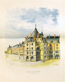 Le plus important commentaire sur la restitution de Questel est fourni par l’architecte César Daly (1811-1894), qui poursuit la démonstration de Lenormant dans un article de la Revue générale de l’architecture et des travaux publics [64]. Regrettant que ce dernier n’ait pas complété son étude par la restitution du temple de la Dive Bouteille, le critique émet une série de réserves à l’endroit du traitement réservé à Thélème par Lenormant, en regard notamment de l’adoption d’une architecture défensive, que rien n’autorise à voir dans le texte de Rabelais, et de l’oubli des différentes pièces que comporte chaque appartement dans le plan tracé par Questel. Ces réserves sont partagées par Arthur Heulhard dans son ouvrage sur Rabelais, ses voyages en Italie, son exil à Metz (1891) : l’historien, auteur de plusieurs études sur l’œuvre de Rabelais [65], prend le contre-pied des thèses de Lenormant en affirmant que « Thélème n’est point construite pour la guerre. (…) La figure géométrique adoptée, les mesures de hauteur et de diamètre données également à chacune des tours, l’absence de créneaux, de fossés et de pont-levis, impliquent un ensemble de régularité, d’harmonie et de paix qui s’écarte absolument des conceptions féodales » [66]. Quant à la grammaire de l’architecture thélémite qui relève toujours des modèles médiévaux selon Lenormant, Arthur Heulhard est d’un tout autre avis lorsqu’il prétend que « la description de Thélème suffirait à elle seule à classer Rabelais parmi les apôtres de la Renaissance » [67], érigeant la description de l’anti-monastère au rang de « manifeste » où l’auteur « étale ses connaissances spéciales avec une propriété de termes remarquable » [68]. La démonstration d’Heulhard est accompagnée d’une restitution en couleur du manoir des Thélémites due à un autre architecte parisien, Léon Dupray (ou Dupré), qui réalise un plan géométrique [69], une perspective et deux élévations de l’une des tours d’angle et du grand escalier, qui délaissent l’aspect féodal de la forteresse esquissée par Lenormant pour faire entrer Thélème dans la première Renaissance (figs 15, 16, 17 et 18). Pour ces compositions datées de 1890 et sorties des ateliers de l’imprimeur et collectionneur parisien Charles Gillot, Léon Dupray s’inspire vraisemblablement du château de Blois (construite vers 1498-1503), absent des modèles cités par Rabelais. On reconnaît en effet les parements de briques rouges et pierres blanches de l’aile Louis XII, avec ses lucarnes à gable et pinacle de style gothique flamboyant, sa toiture d’ardoise, ses gouttières peintes en diagonale d’or et de bleu qui descendent le long du mur, de même que les colonnes à fûts losangés de la galerie Charles d’Orléans, visibles côté cour, et l’escalier monumental de l’aile François Ier, sur lequel l’architecte a fait graver l’inscription ornant la « porte » de Thélème.