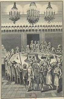 Le Spectateur-nocturne a une vie sociale bien remplie : il assiste à des soupers et fréquente le salon littéraire de Fanny de Beauharnais. Les estampes qui en témoignent sont historiques aujourd’hui, servent de preuves, d’archives. La fig. 14 commémore le second repas donné par le jeune Grimod de La Reynière dans l’Hôtel de ses parents aux Champs-Elysées. Rétif y est entouré par Mercier, et les frères Trudaine. Il a gardé son chapeau parce qu’il est enrhumé. Il rencontra Grimod de La Reynière le 22 novembre 1782 ; ils furent grands amis, mais leurs prises de position différentes à la Révolution les séparèrent. Sa première visite à la comtesse Fanny de Beauharnais date du 8 juin 1787. Elle était connue pour vivre la nuit et sa présence dans Les Nuits de Paris est doublement justifiée, non seulement en raison de son salon, mais encore parce qu’elle est restée la protectrice de Rétif jusqu’à la fin de sa vie. La partie « mondaine » de la vie de Rétif se trouve ainsi attestée, et contredit les biographes les plus acharnés contre lui.
