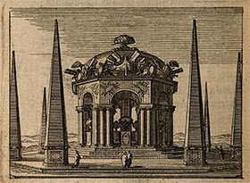 leur fit élever à Modin, un tombeau magnifique, que la somptueuse structure d’un grand rang de colonnes et de portiques, sept hautes pyramides [il n’y en a que six dans la gravure] et les superbes ornemens de plusieurs trophées d’armes et les navires rendaient extrêmement riche et pompeux [51].